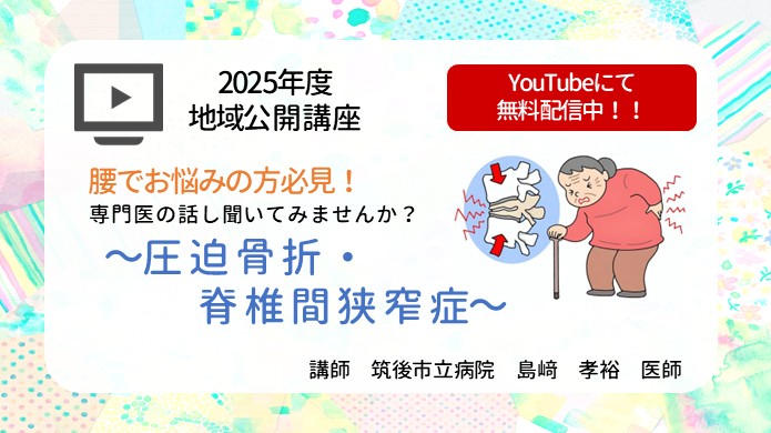 | 2025年12月01日 | 地域公開講座 腰でお悩みの方必見!専門医の話聞いてみませんか?~圧迫骨折・脊椎間狭窄症~ YouTubeで配信しています |