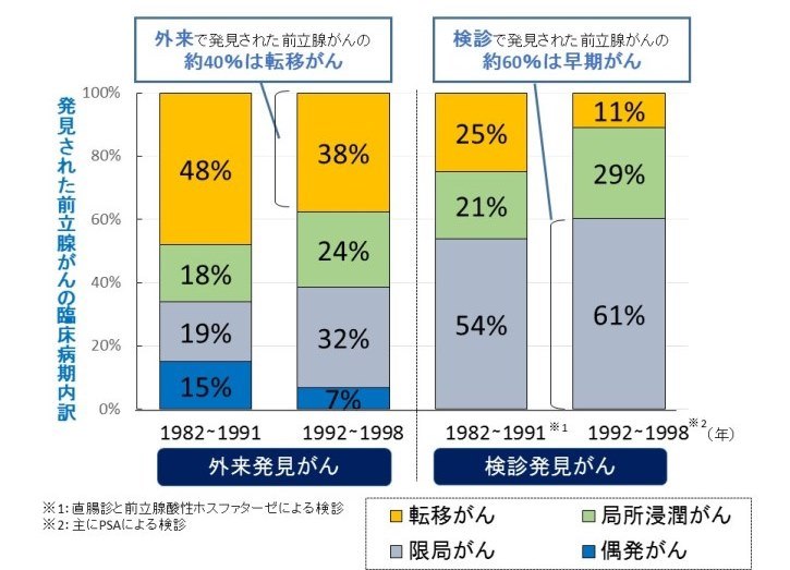 自覚症状が出てから泌尿器科外来を受診し発見される前立腺がんの約40%はほかの臓器に転移しており、一方PSA検査などの検診で発見された前立腺がんの約60 %は早期のがんだったという研究結果があります。